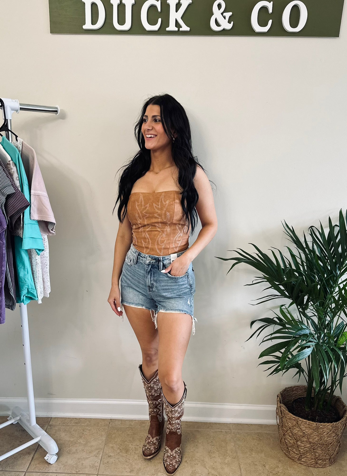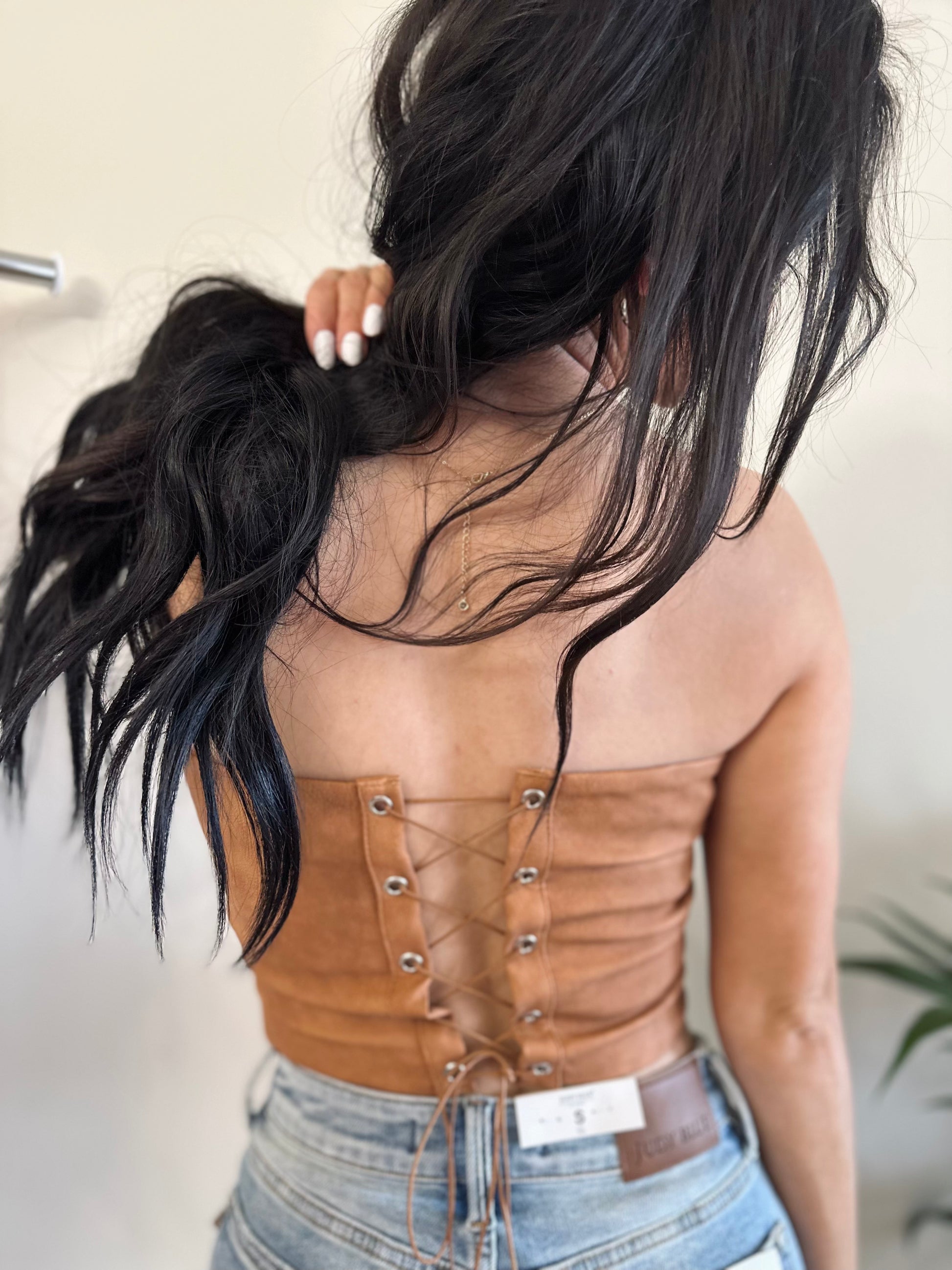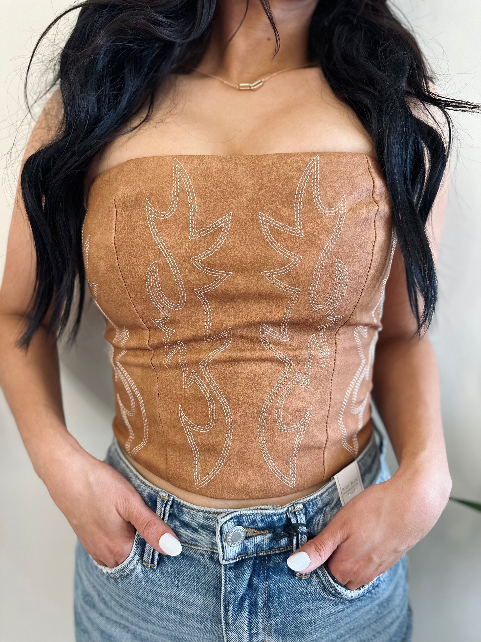 Saddle up with Beckee's Vegan Leather Embroidered Western Corset Top. Made with rich, brown vegan leather, this top adds a touch of edge to any outfit.