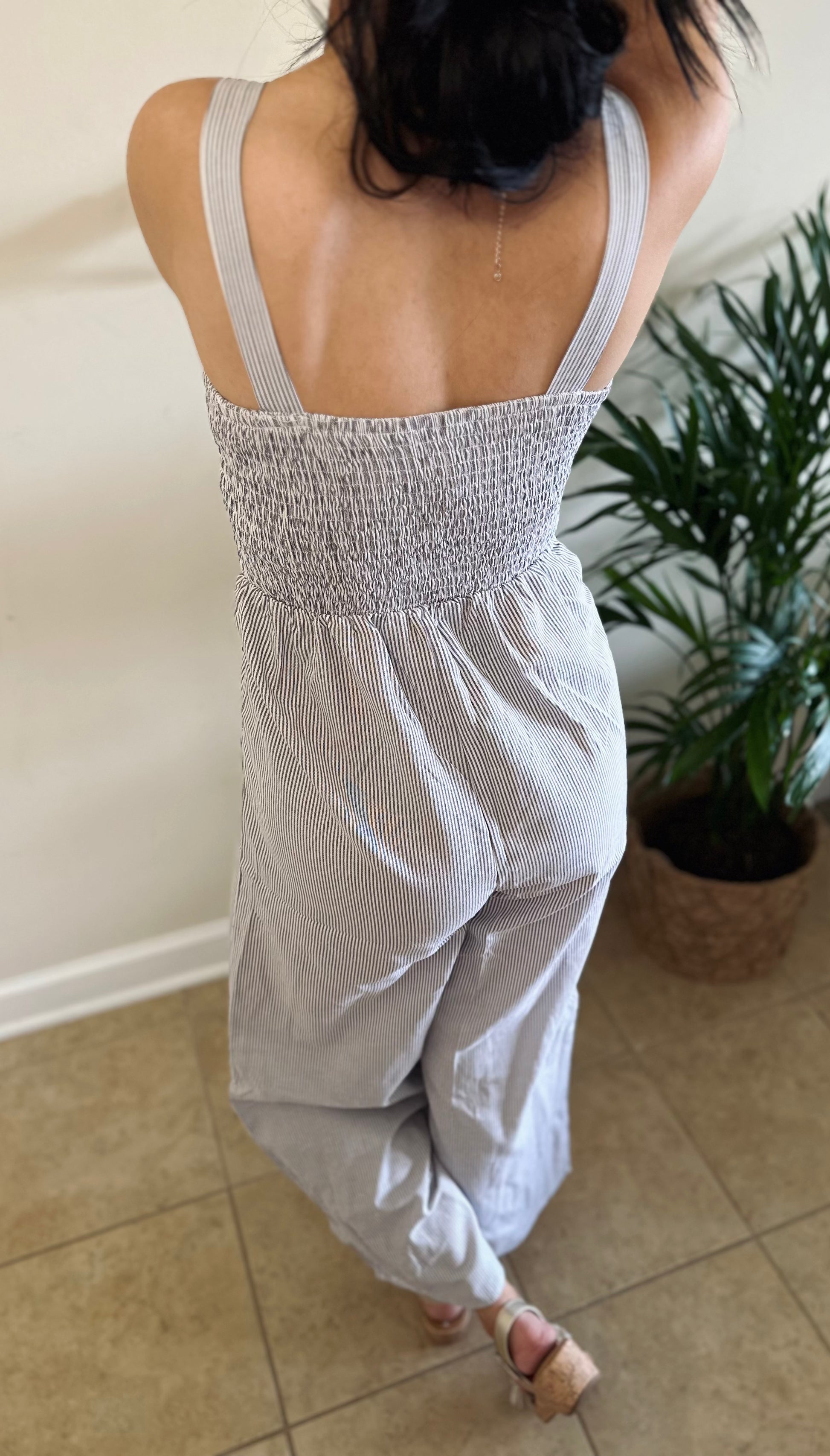 The Black Stripe Wide Leg Jumpsuit boasts a charming half button front and smocked backless design, adding intricate elements to its chic and comfortable style.Go with the flow in this jumpsuit with a wide leg design that makes it oh-so-breezy. A absolute one & done, grab and go outfit! Endless style options to personalize your look!