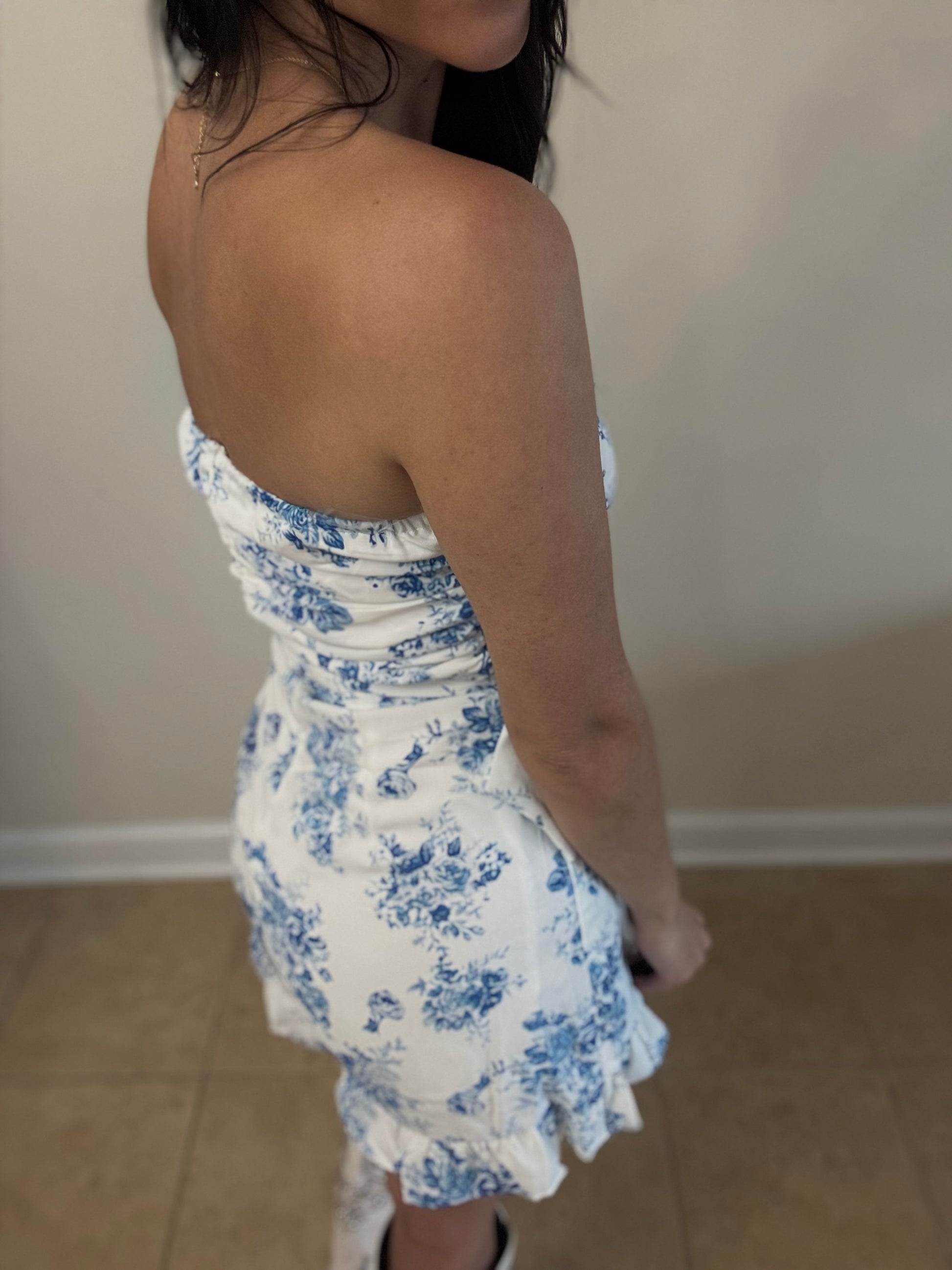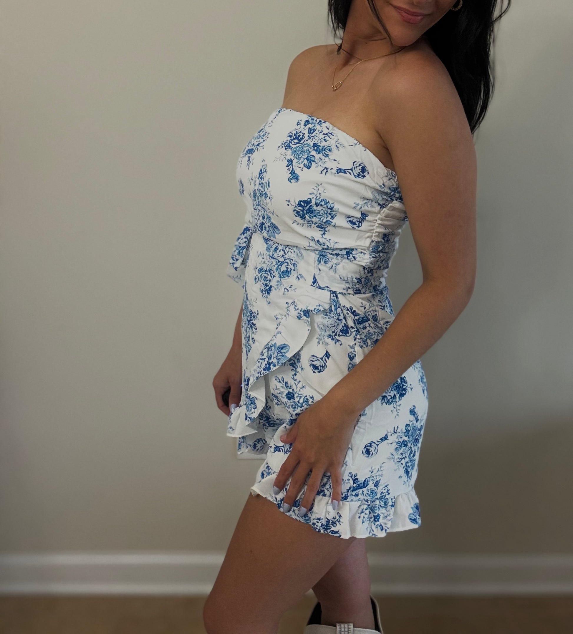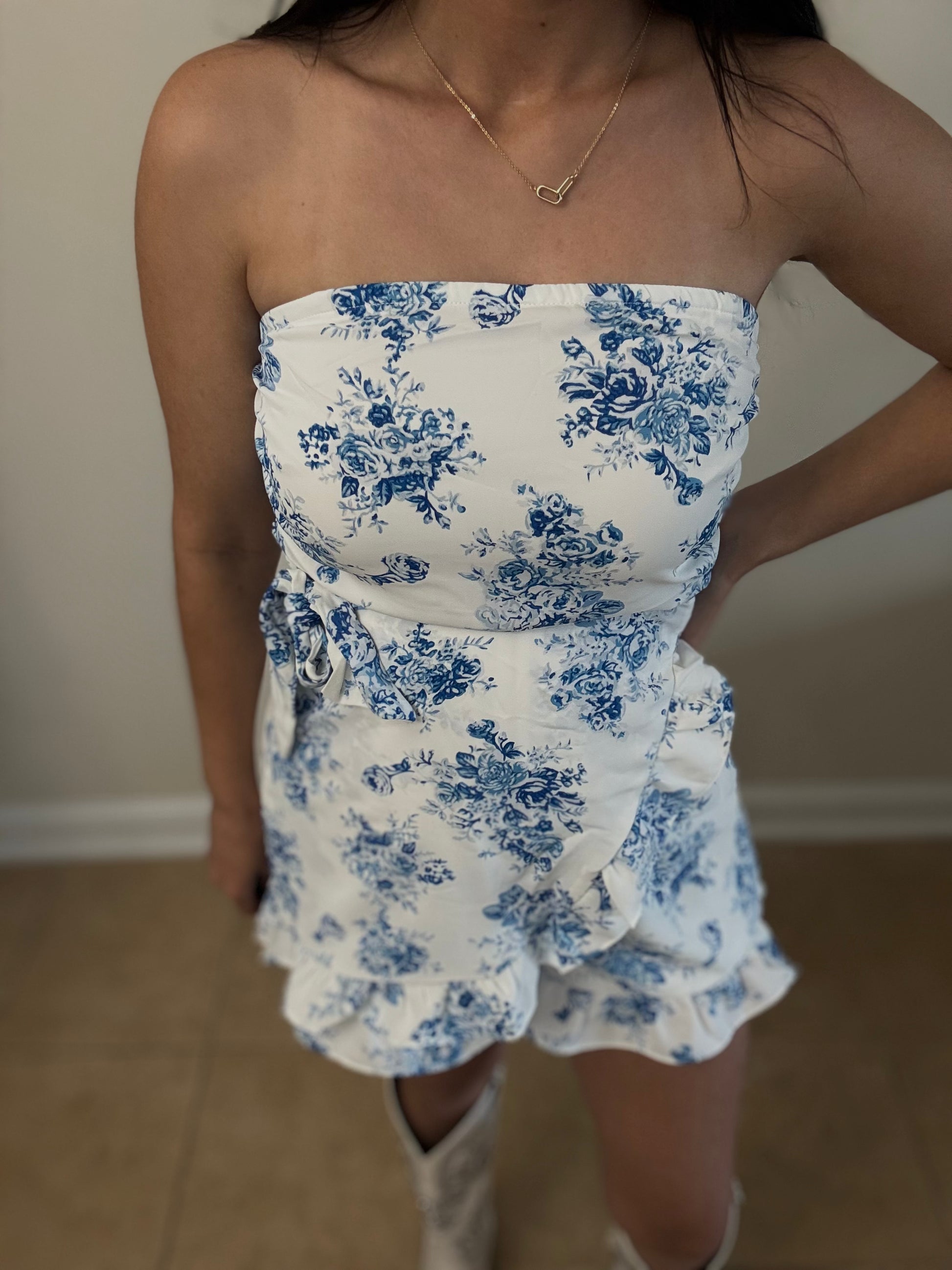 Elevate your summer wardrobe with our Blue Floral Strapless Ruffled Romper! Featuring an adjustable knot waist and zipper closure in the back, this romper is both stylish and comfortable. The playful floral strapless design adds a touch of whimsy to any outfit. Perfect for a day in the sun or a night out with friends. (Just don't forget the sunscreen!) 😉