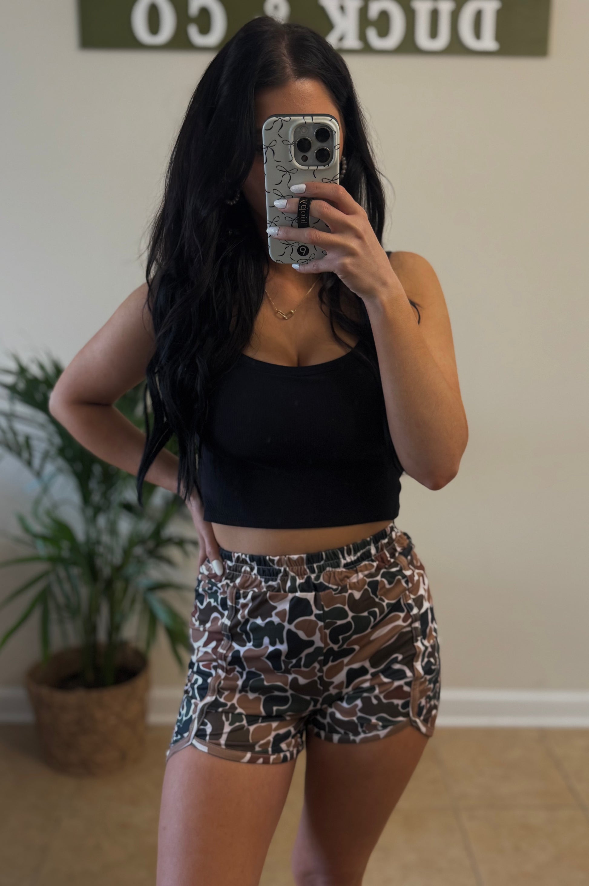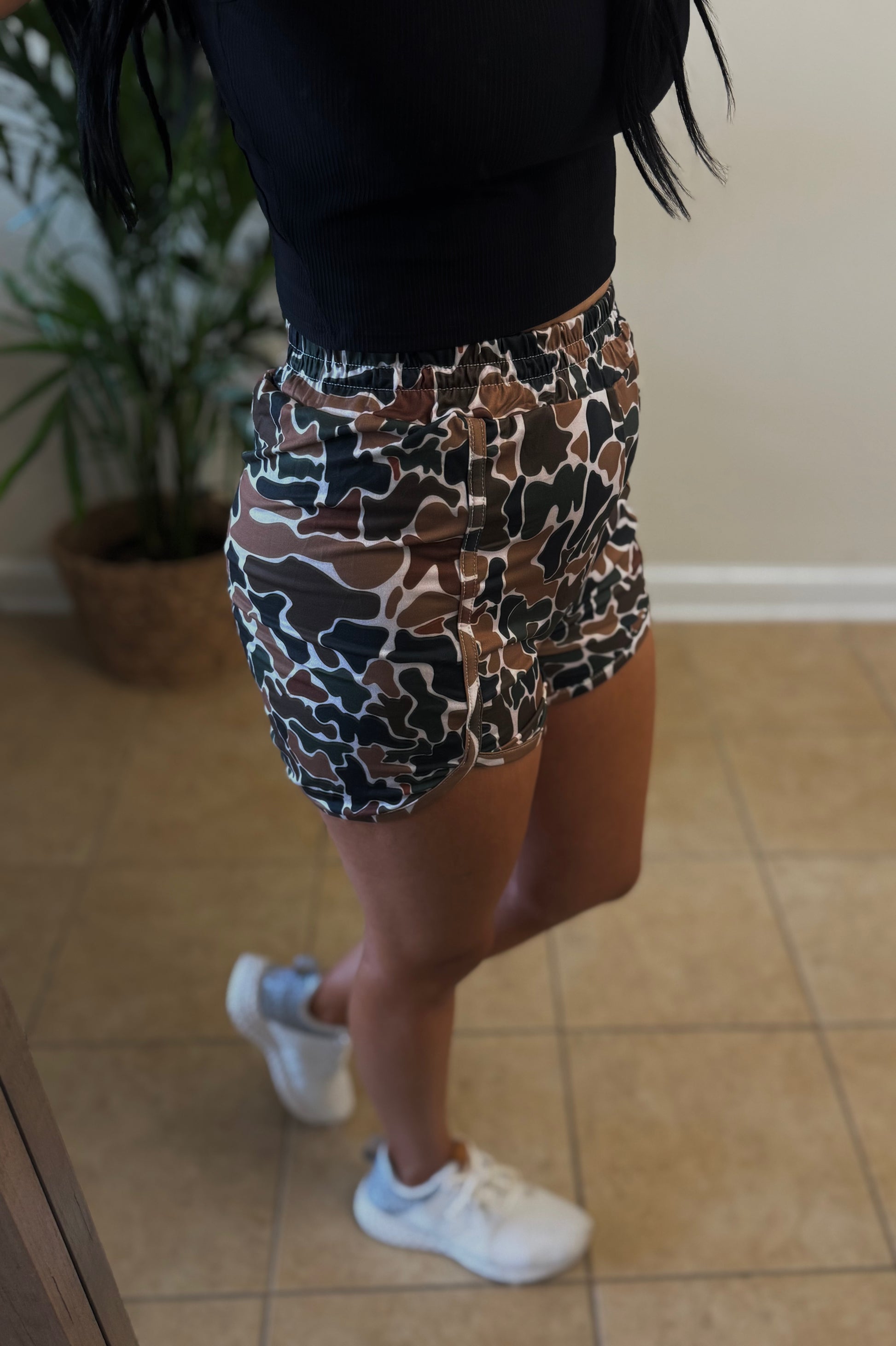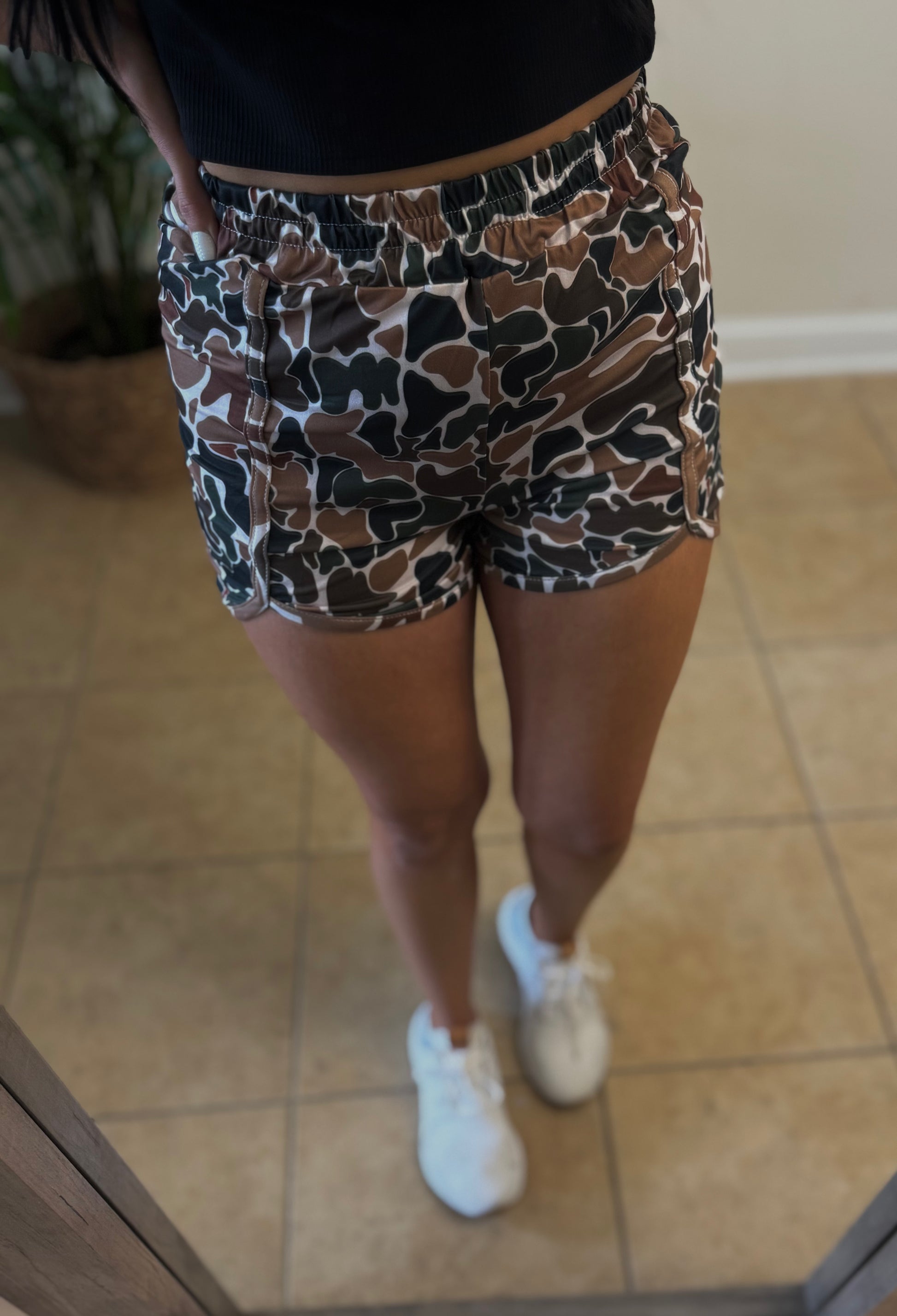 The brown camo shorts feature a front slit, high waist, and thick band for a comfortable and stylish fit.