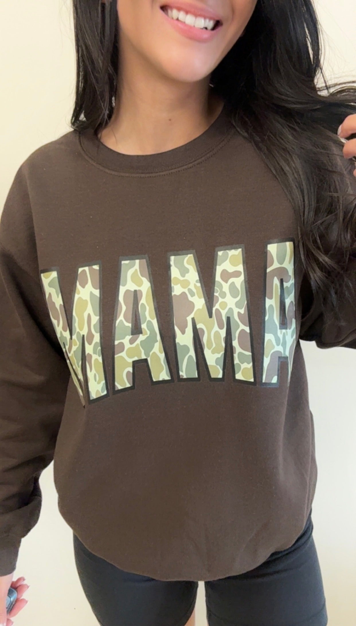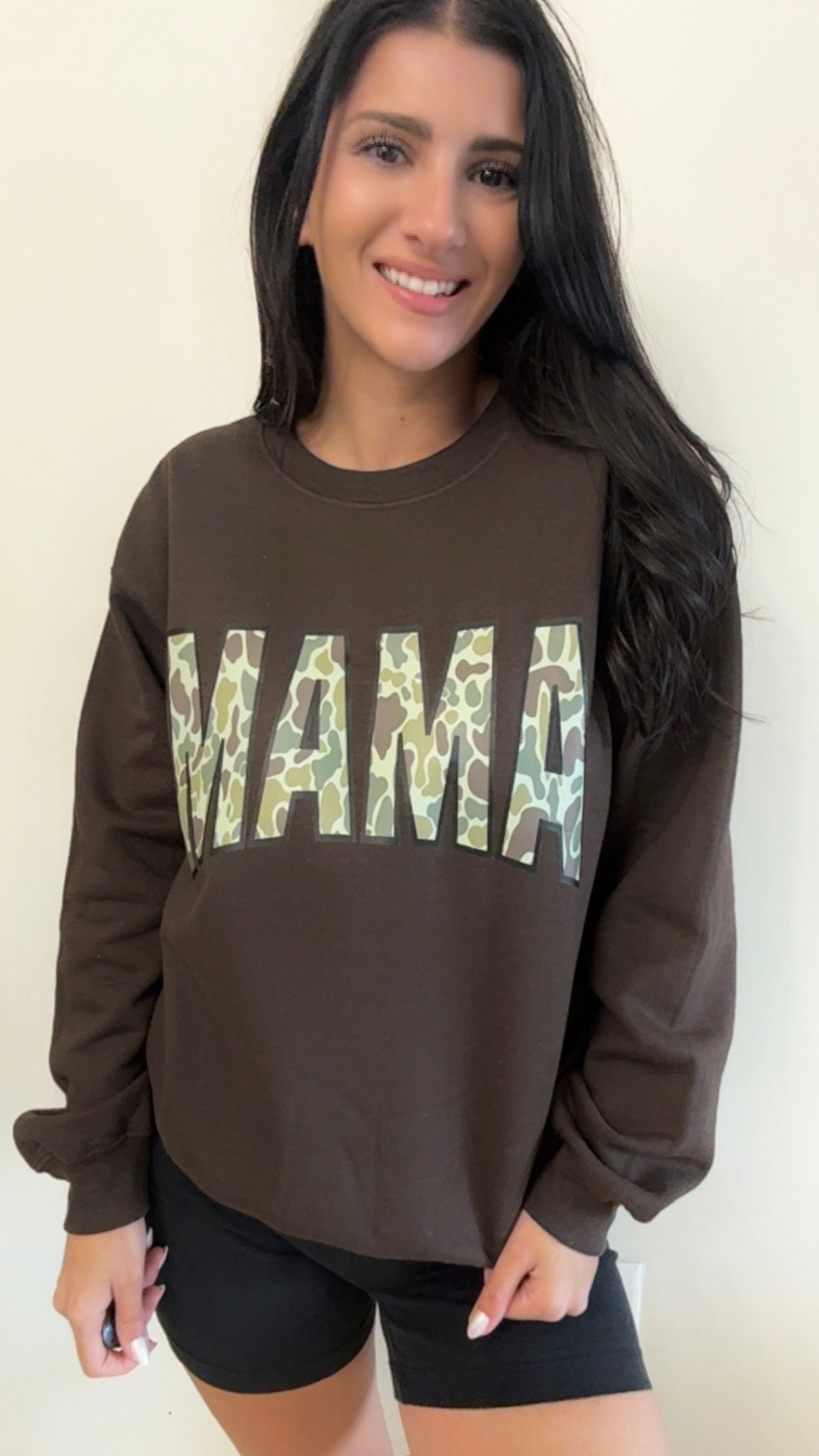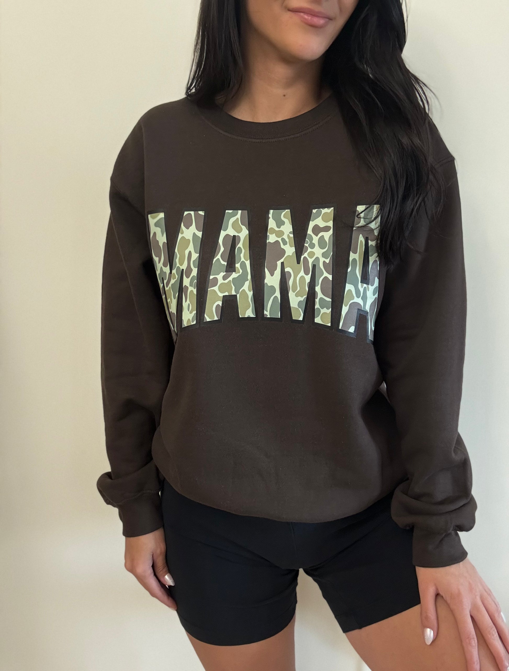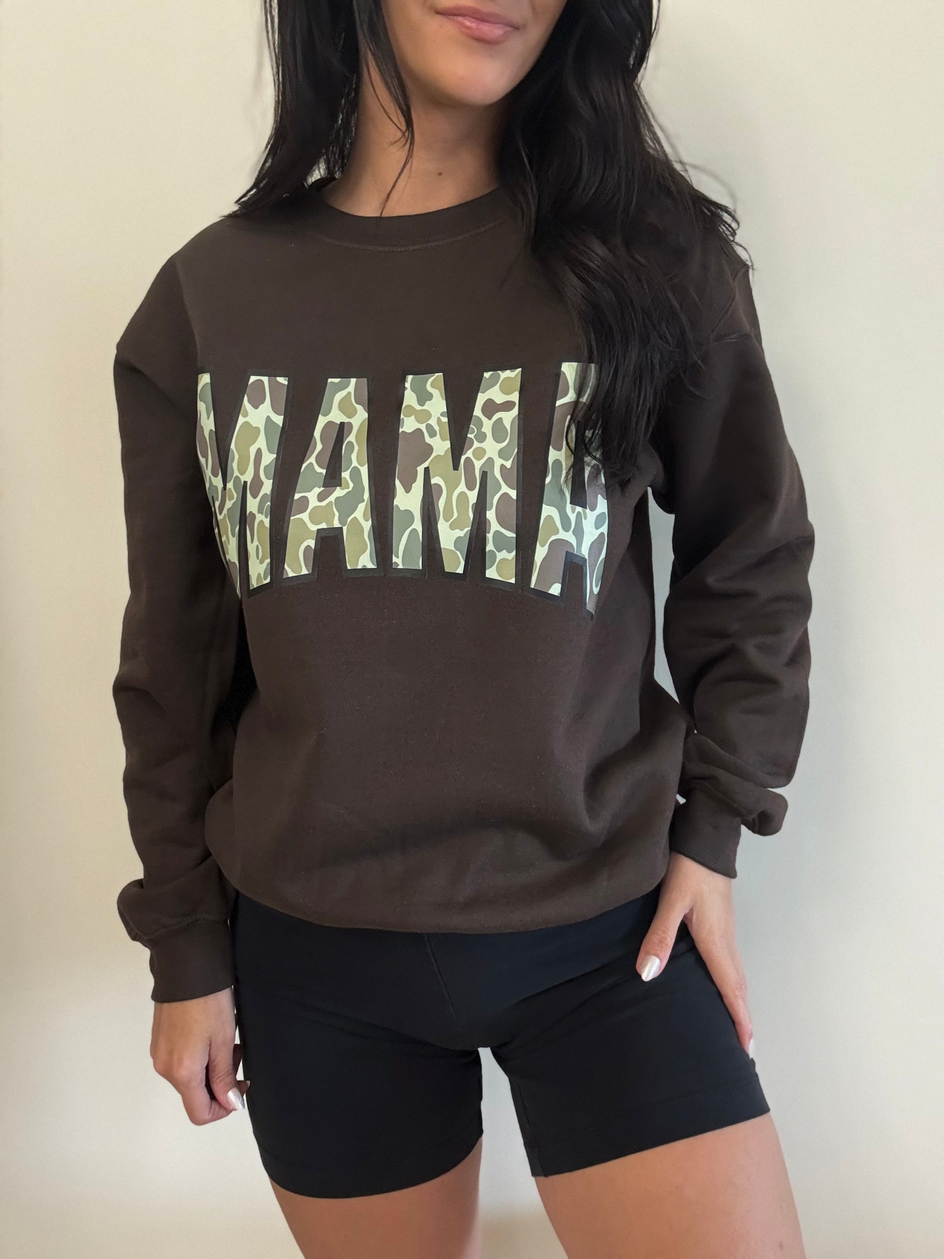 This Camo MAMA Sweatshirt made of incredibly soft and cozy material in a rich brown color. Stay stylish as a busy mom as its perfect for any errand. Rock it with shorts, jeans, or throw on with leggings while on the go.