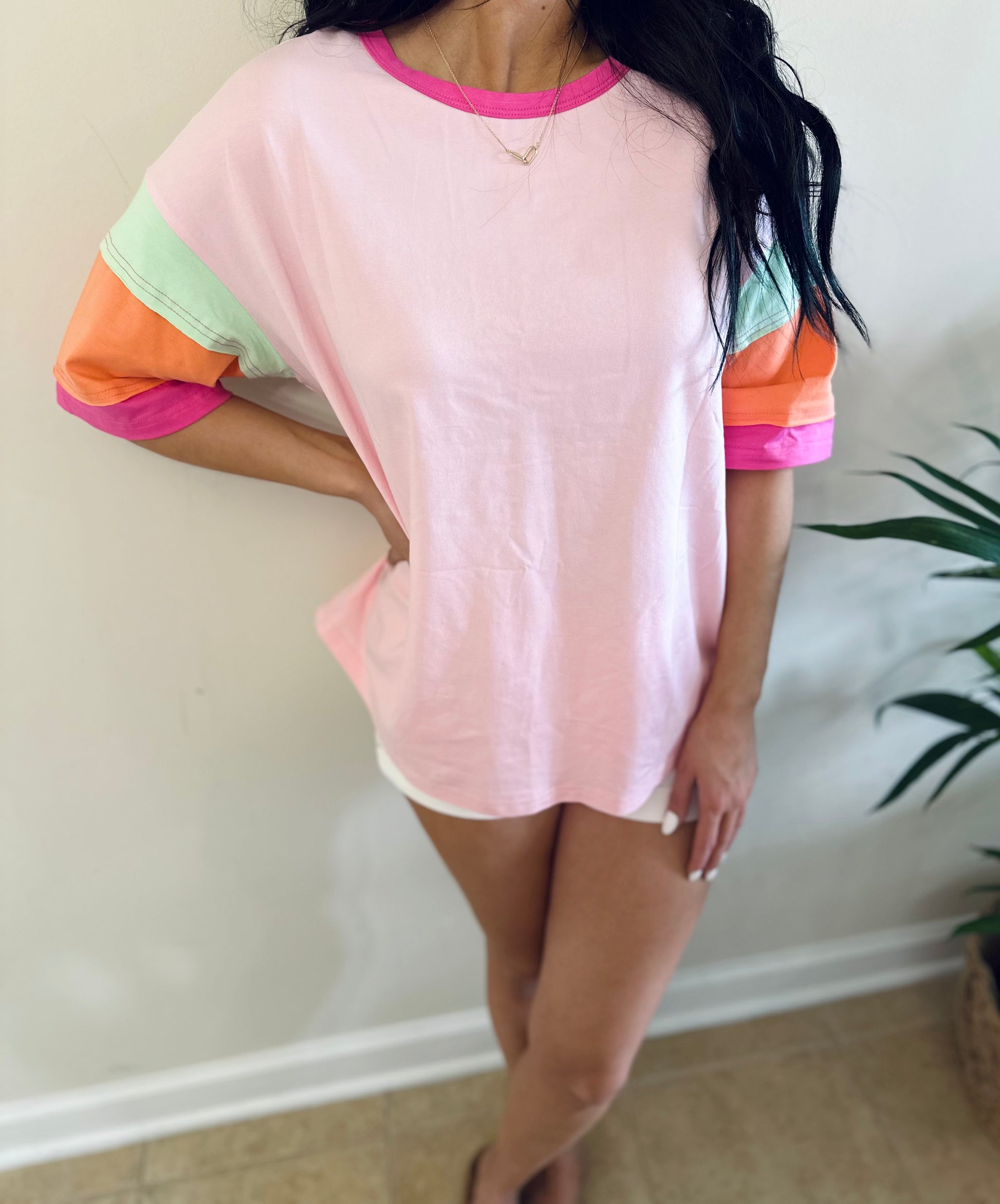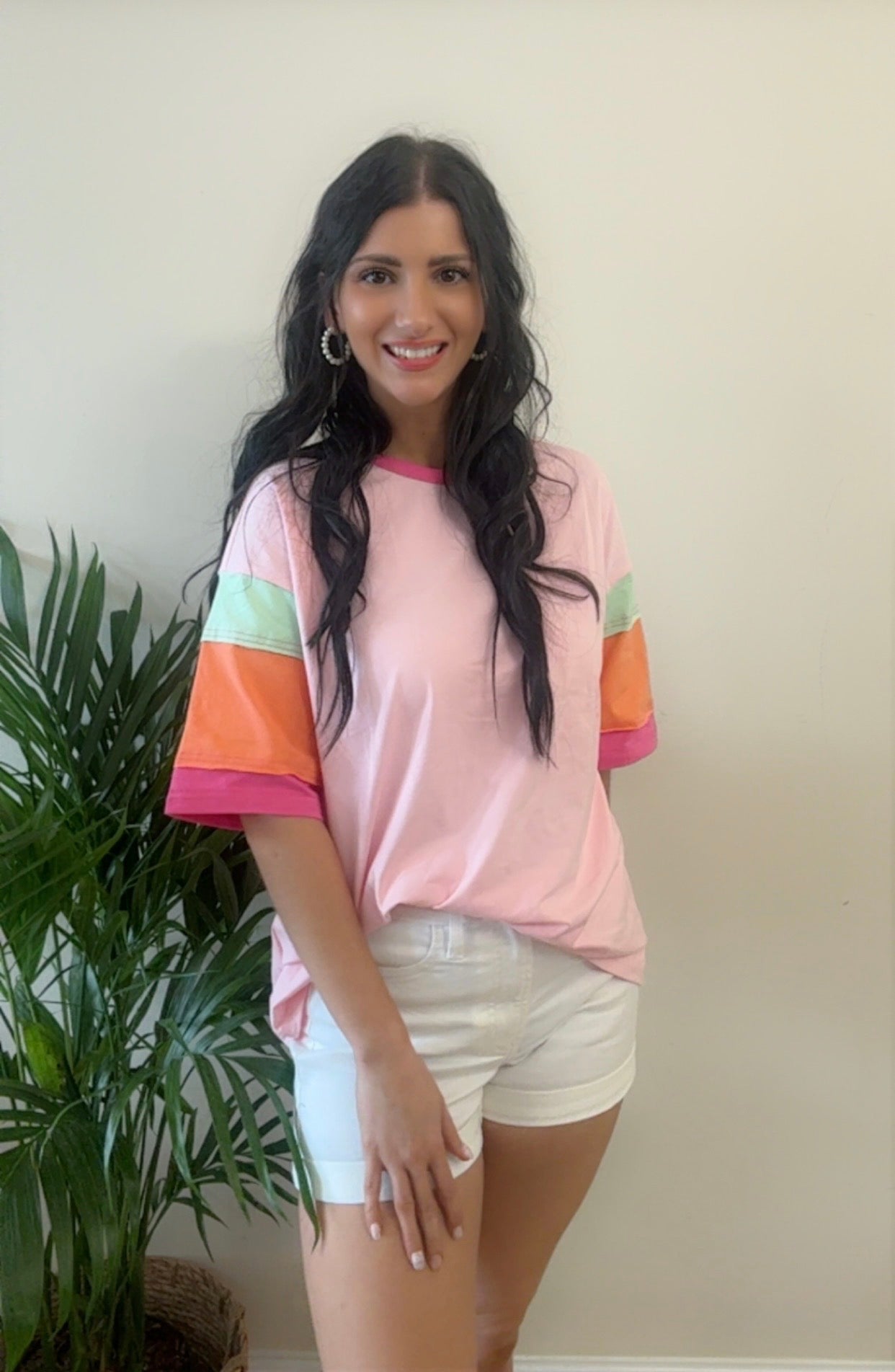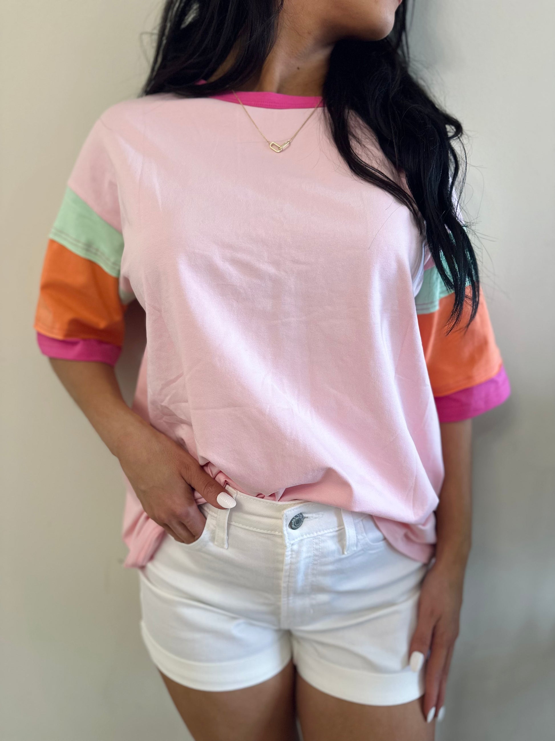 Elevate your summer wardrobe with this color block cotton-blend top; with half sleeve length and relaxed with a round neck and dropped shoulders. The raw cut stitching on the sleeves adds a unique touch, while the oversized fit ensures ultimate comfort. In a variety of vibrant colors, this top will brighten up any outfit.
