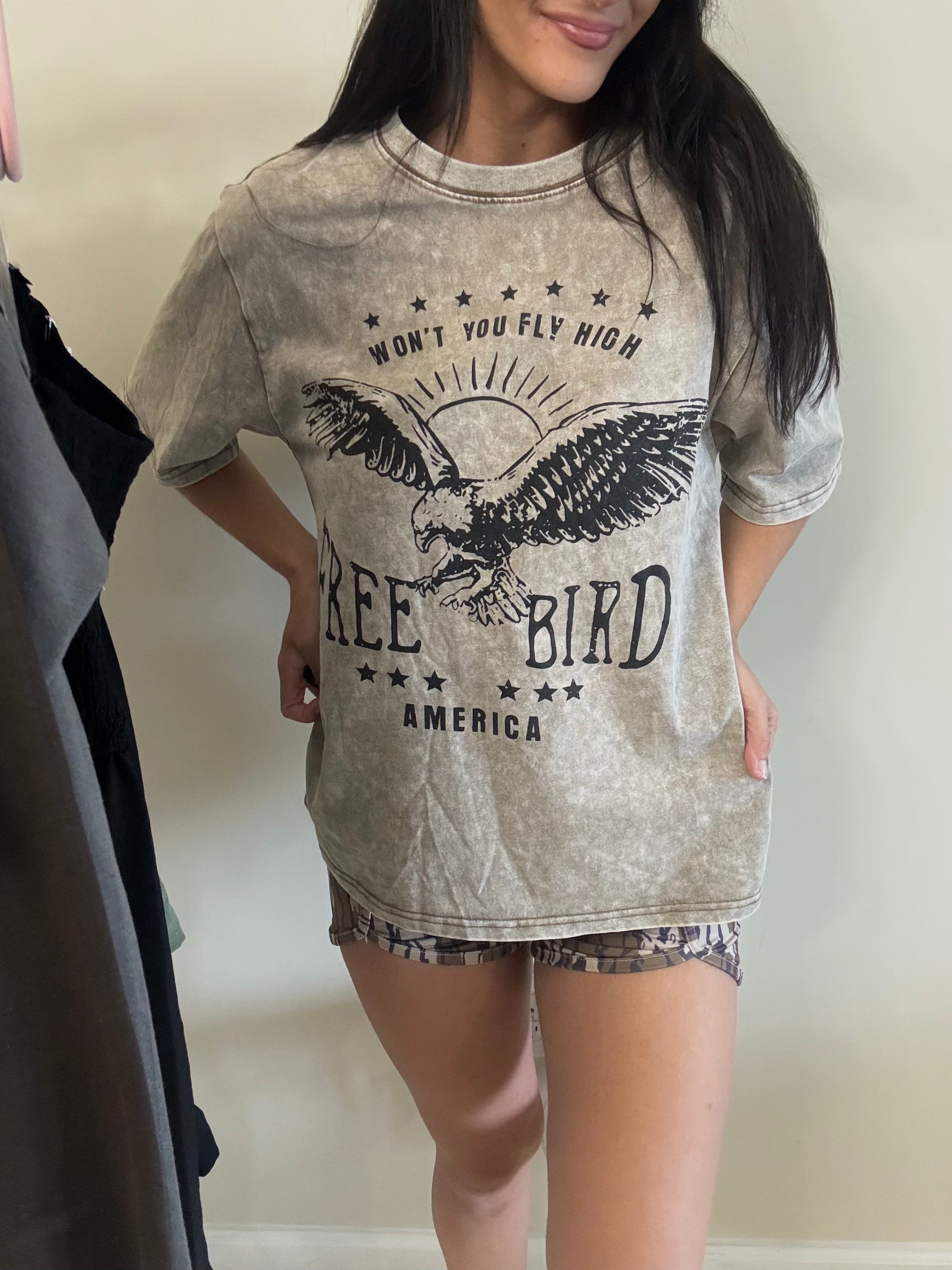 This Free Bird Vintage Graphic Mineral Washed Tee brings a touch of nostalgia. With its vintage design, this tee is perfect for those seeking a unique and retro style. Made with high-quality fabric, it offers both comfort and style. Add a vintage vibe to your wardrobe with this must-have tee.