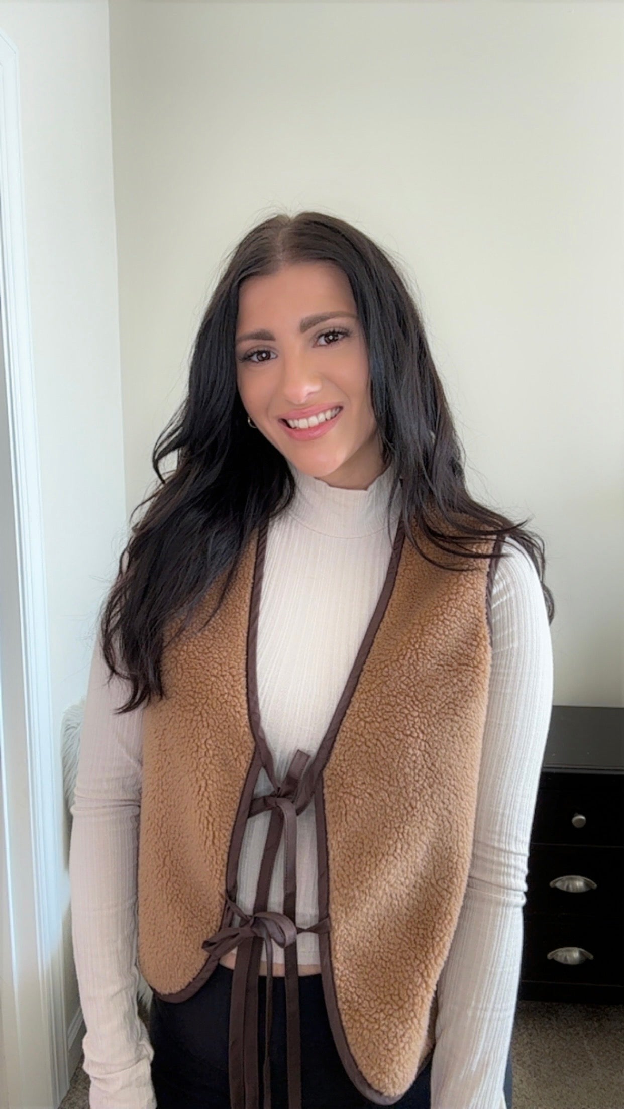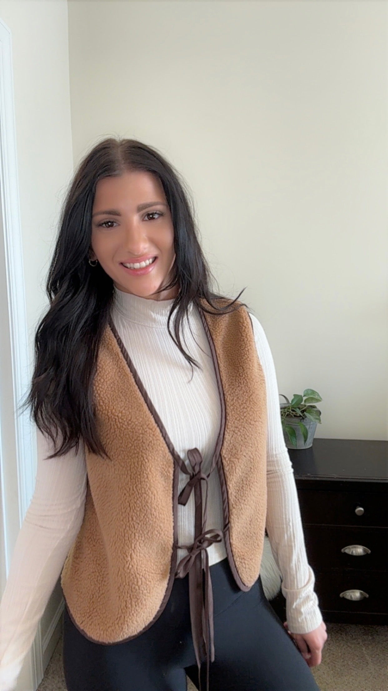 Upgrade your outfit with the charming, elegant Sherpa Contrast Trim Tie Front Vest. Lightweight and perfect for fall/winter occasions, this vest will add an extra touch of style to your wardrobe.