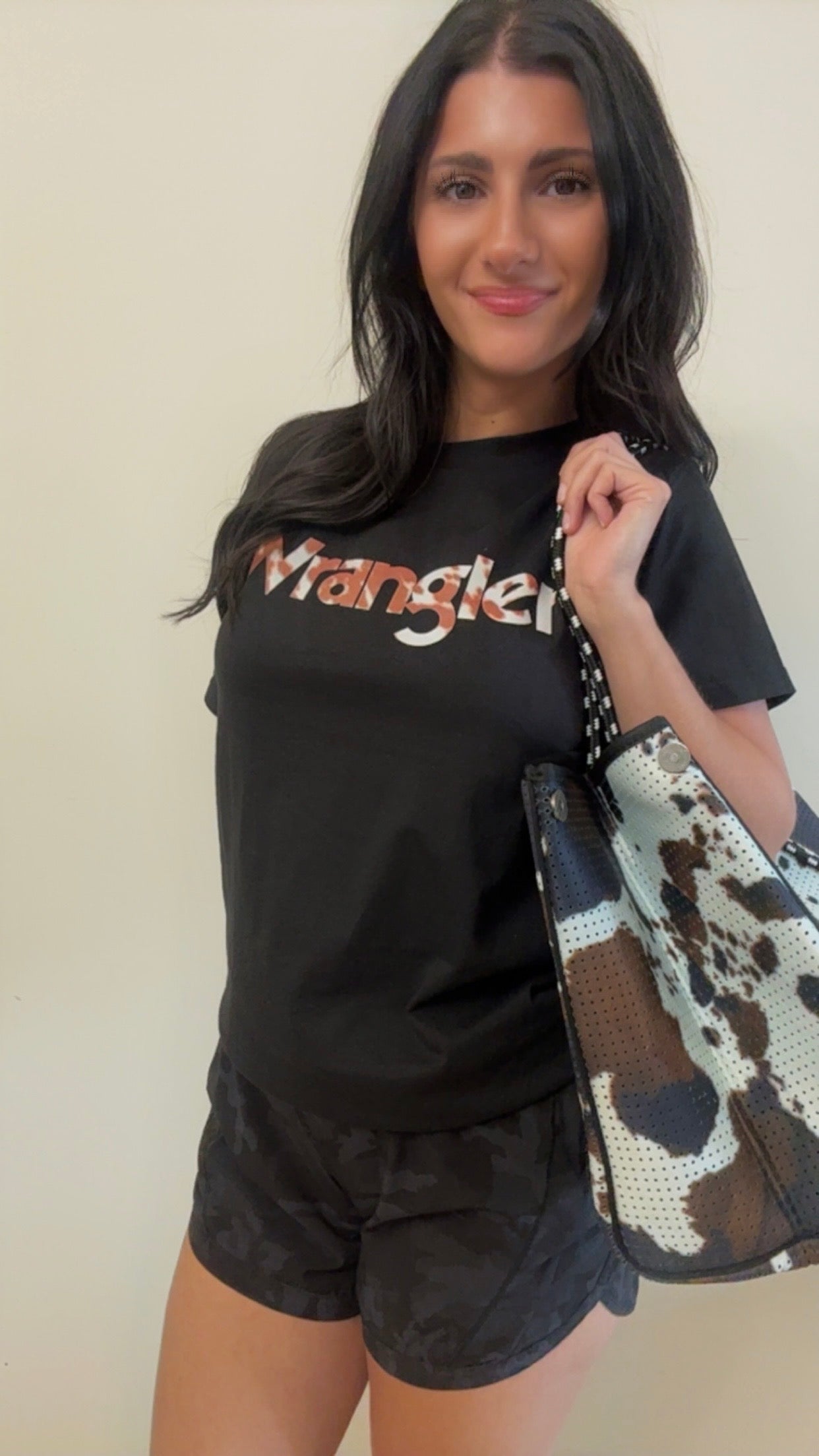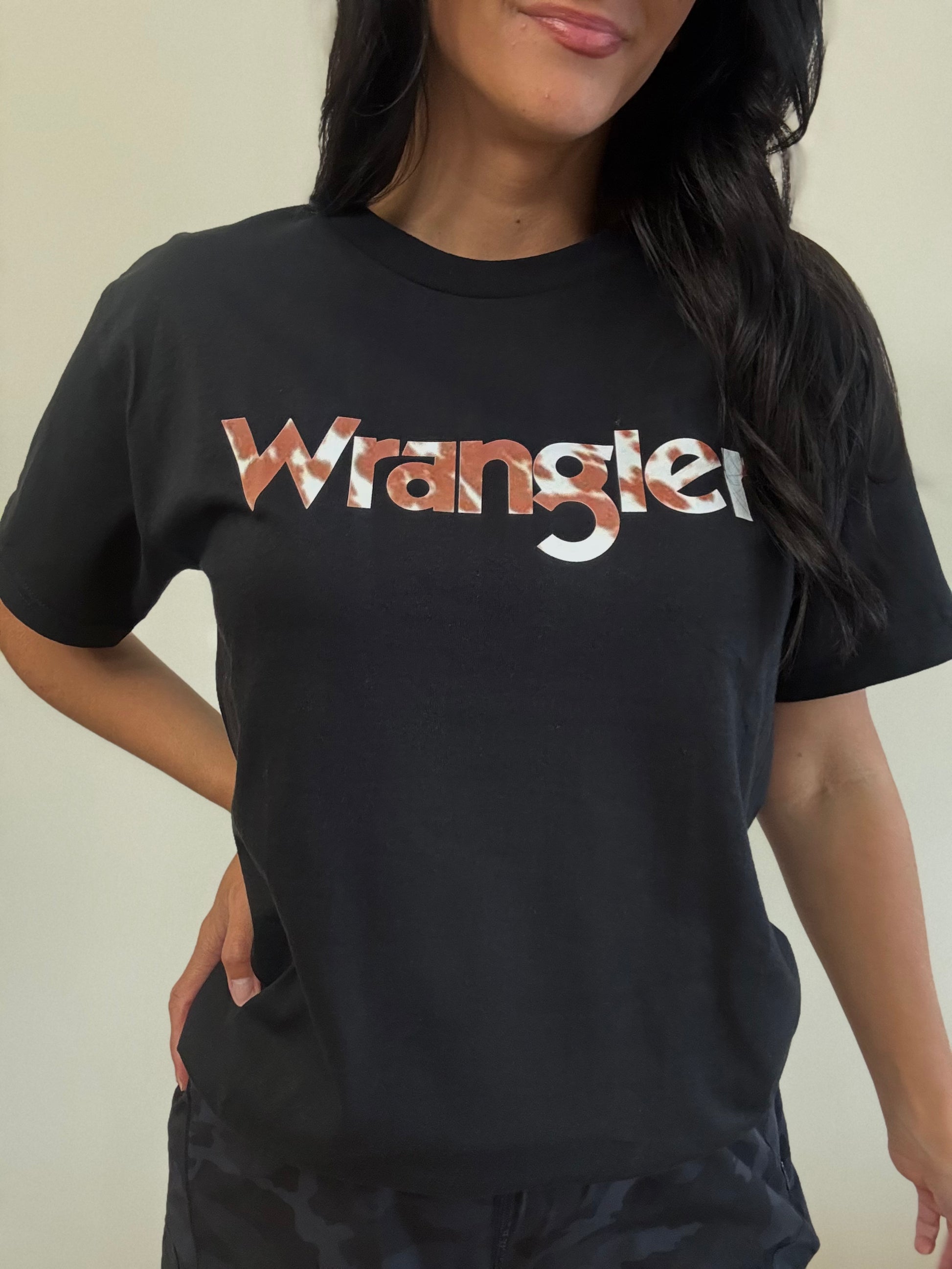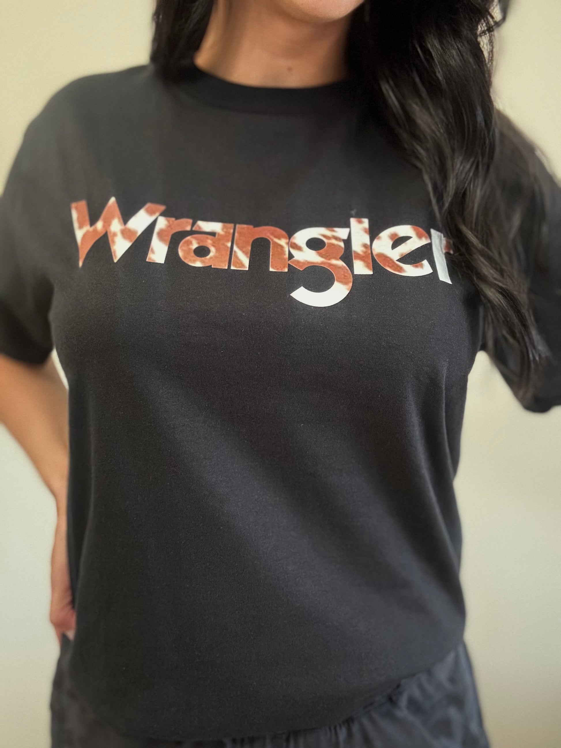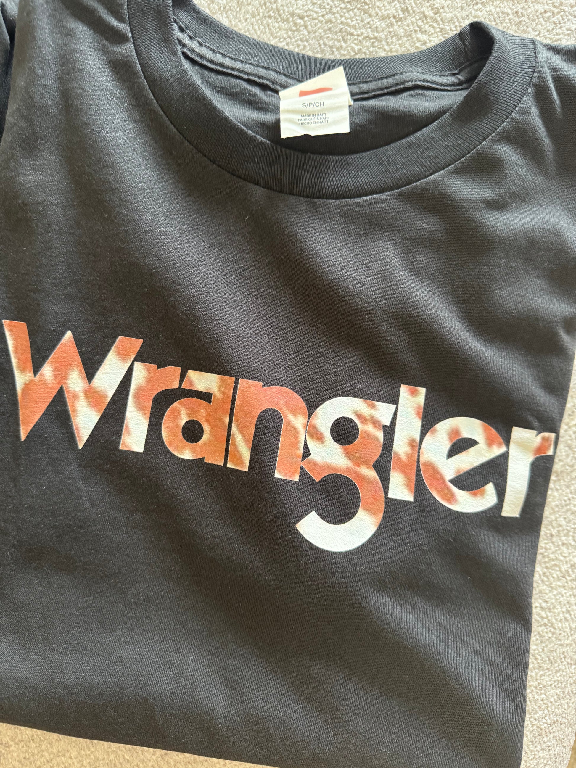 The Wrangler - Block Cow Tee is crafted from 100% pure cotton, offering exceptional comfort and breathability. Featuring a distinctive block cow design, this black tee combines classic style with a modern graphic edge. Ideal for everyday wear, its soft fabric ensures durability and a perfect fit, making it a versatile addition to your wardrobe.