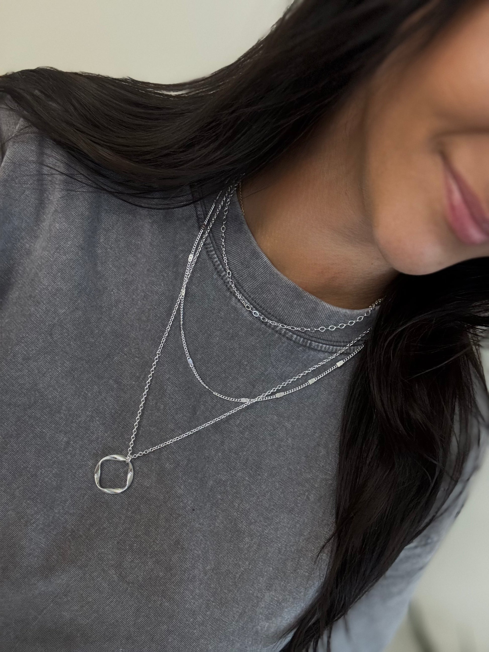 Introducing our Triple Layered Necklace - a sleek, silver accessory featuring three layers of delicate chains, each adorned with a twisted open circle charm. Elevate any outfit with this versatile piece that adds a touch of elegance and style. Perfect for any occasion, this necklace is a must-have