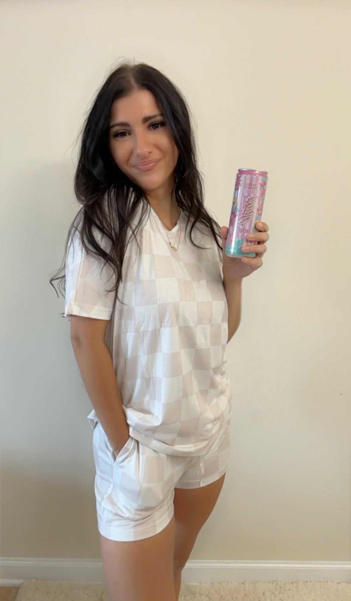 This beige shirt and shorts combo features a fun checkered pattern perfect for lounging on those lazy days. Kick back and relax in this cozy and comfortable set. You'll never want to take it off! (Seriously, you won't want to!)