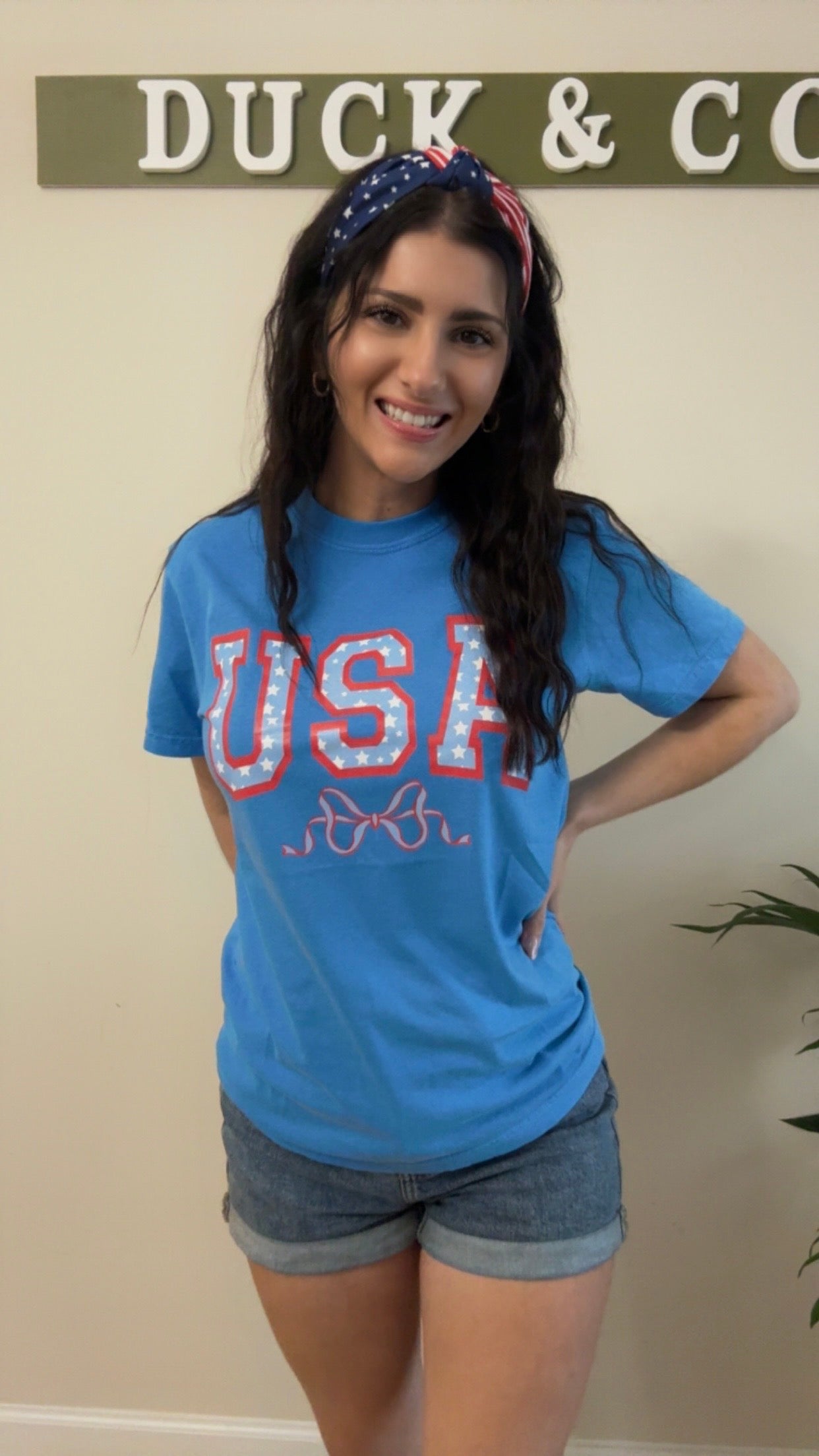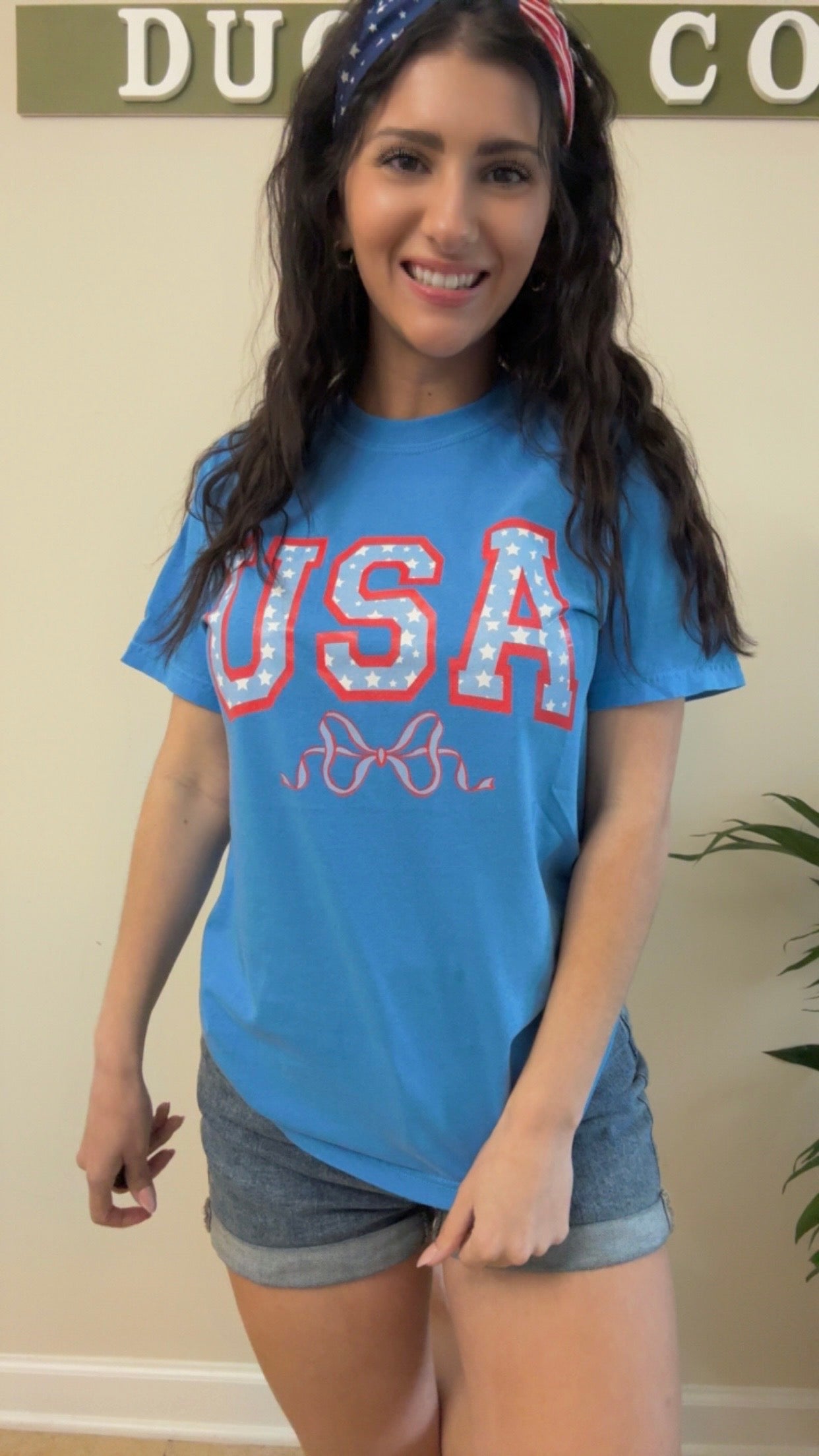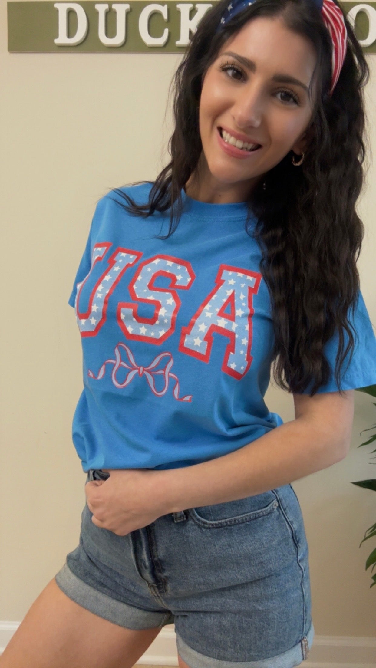 Stay comfortable and stylish in the USA Stars & Bows Graphic Tee by comfort colors. Made from 100% cotton and featuring a royal Caribbean blue color, this tee is adorned with stars and a bow for a cute and patriotic touch. Perfect for any casual occasion.