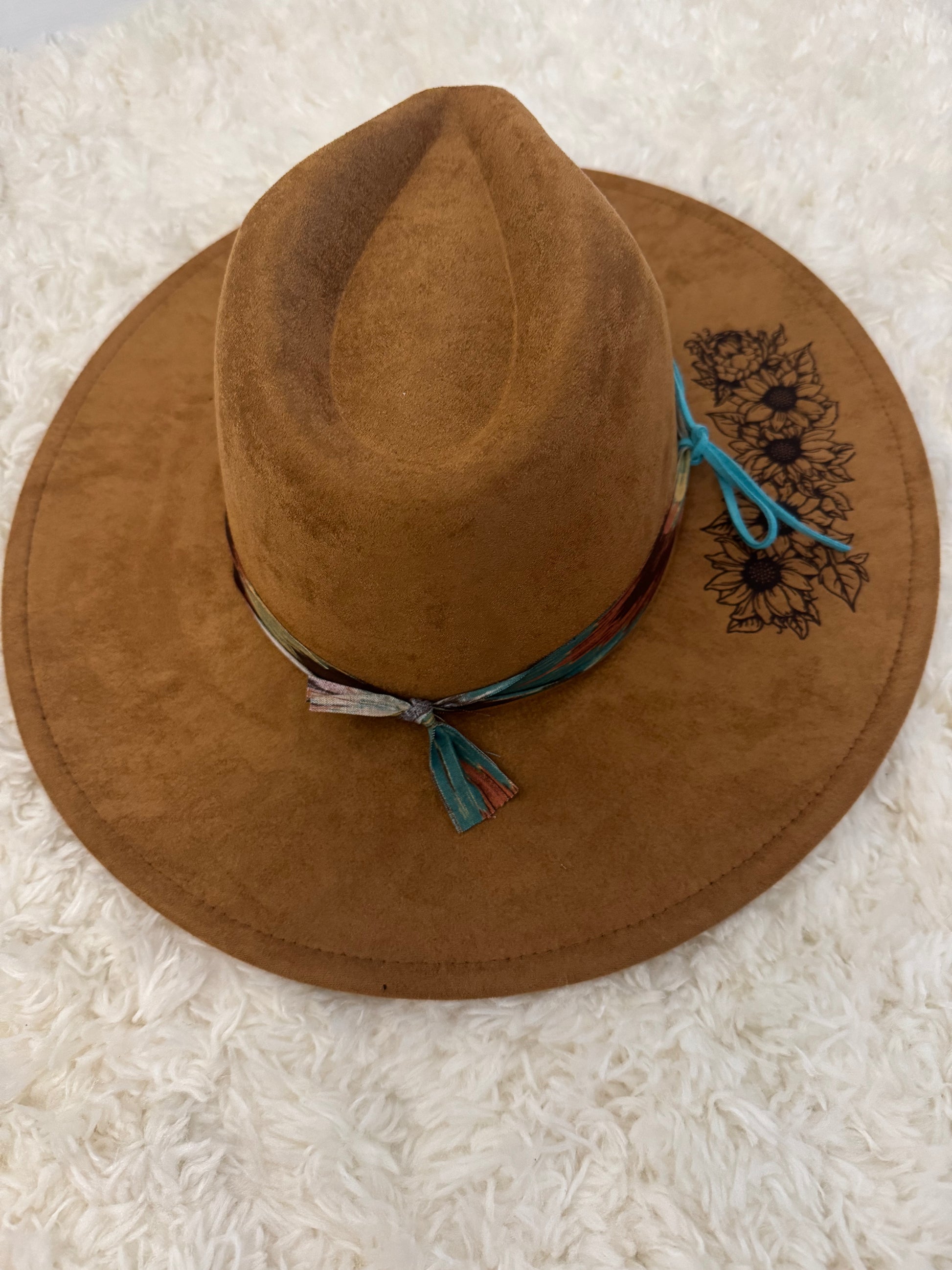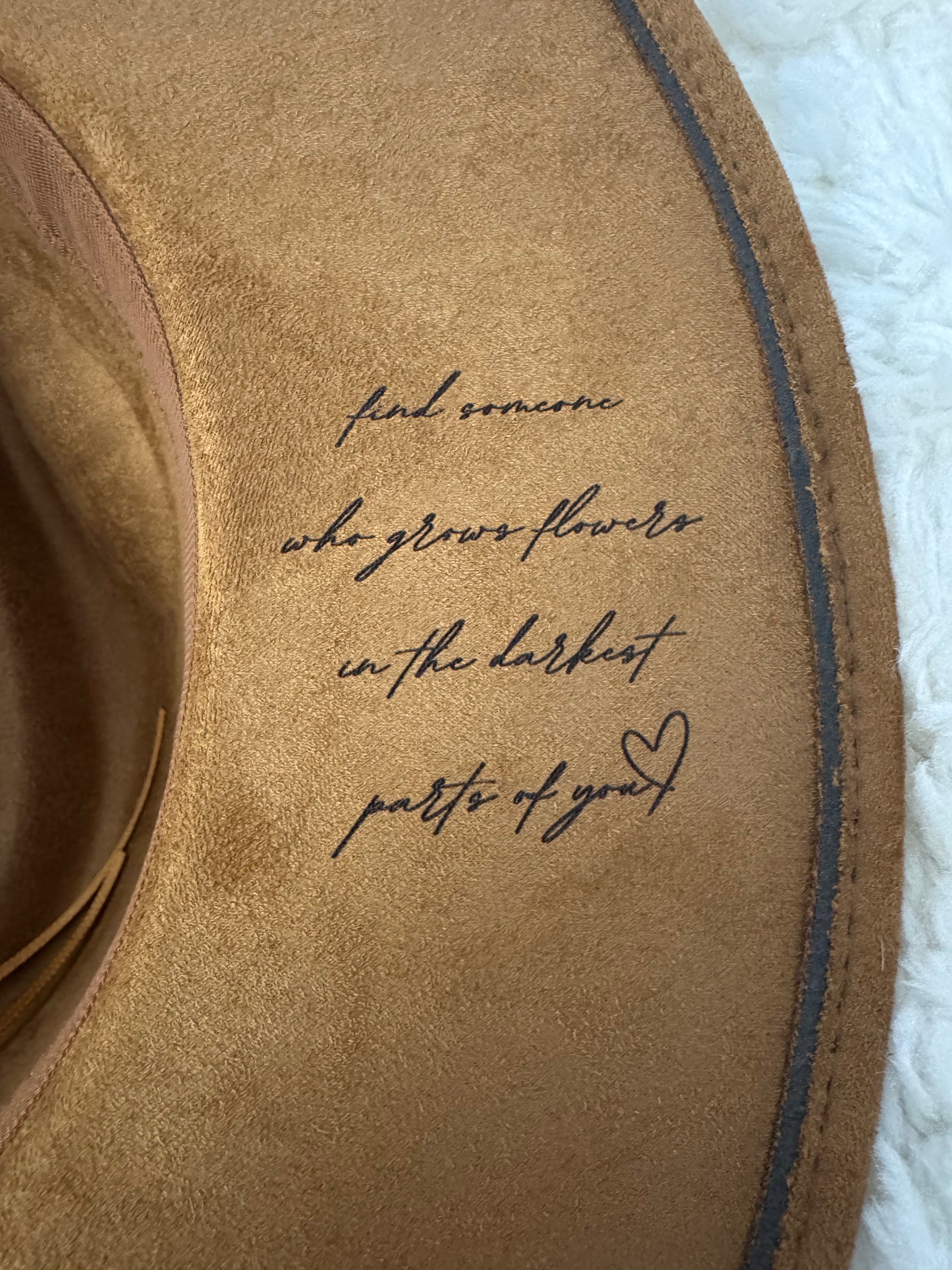 “Find someone who grows flowers in the darkest parts of you” on the underside of the brim in beautiful script. The brim features a row of gorgeous sunflowers. Burnt onto our beautiful rancher style hat made of Vegan Suede. Color is Tan. All hats are fully adjustable and lightly lined. Suitable for all seasons due to the lightweight breathable fabric.