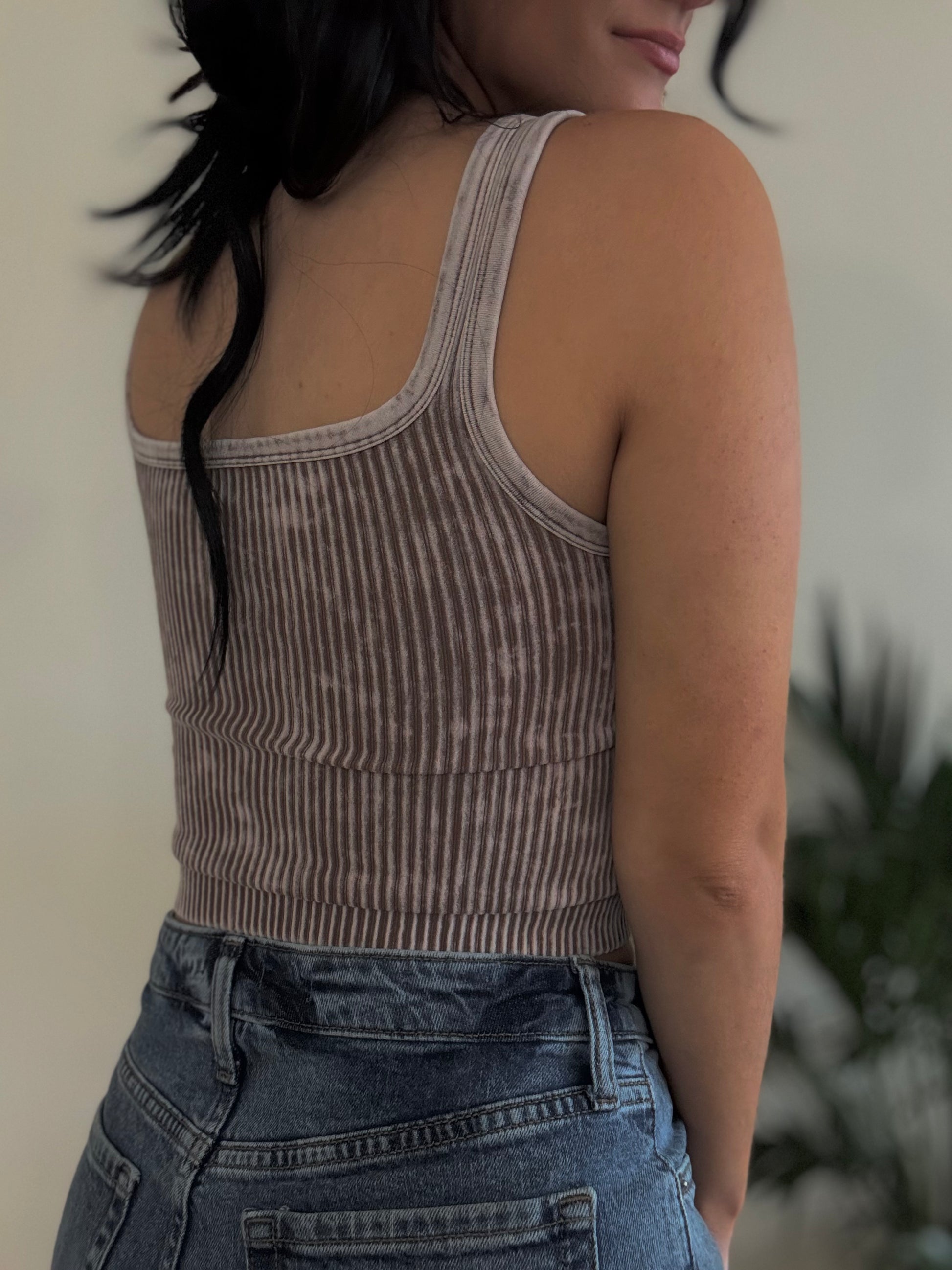 Our Zenana tank comes in faded/washed black and brown. Featuring cropped length and a v- neck. This tank comes with a removable bra for added support. Super stretchy and soft materials. Great for all day wear or at the gym.